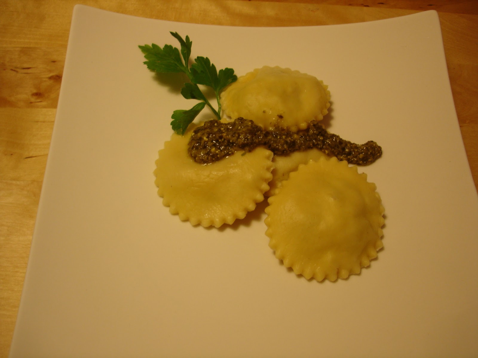 cremige Soße um die Ravioli legt.