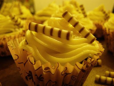 Löffel glatt rühren. Die Creme dekorativ auf den Cupcakes anrichten. Die Kuchen kalt stellen und erst vor dem Servieren mit den Schokozebraröllchen