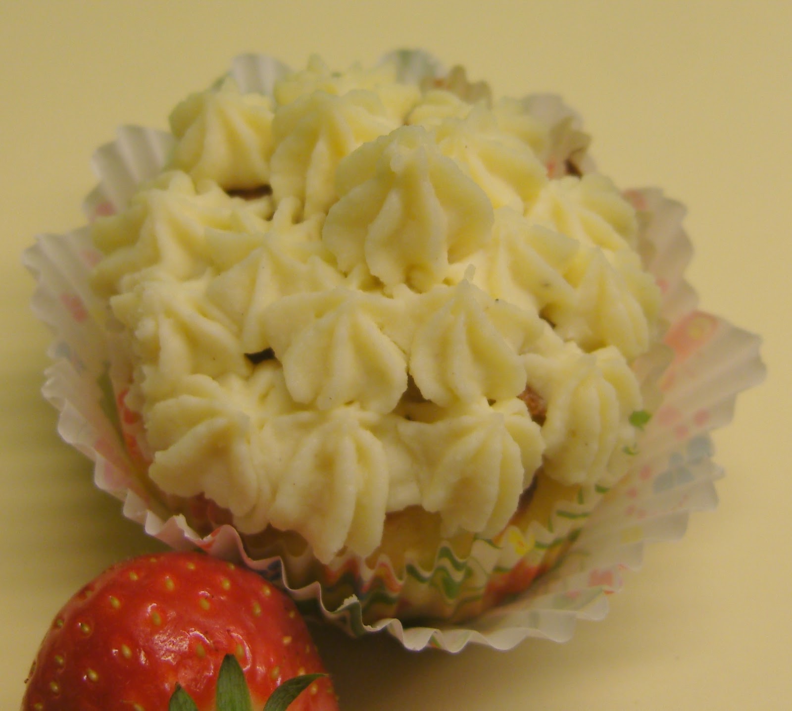 Dies hier ist mehr oder weniger ein Muffin-Teig, der als Cupcake gemacht ist. Der sonst übliche Schmand im Teig ist durch leckeren Vanillepudding ersetzt und macht den kleinen Kuchen dadurch schon vanillig und saftig. Natürlich passen hier sehr gut Erdbeeren auf die Frischkäse-Buttercreme!