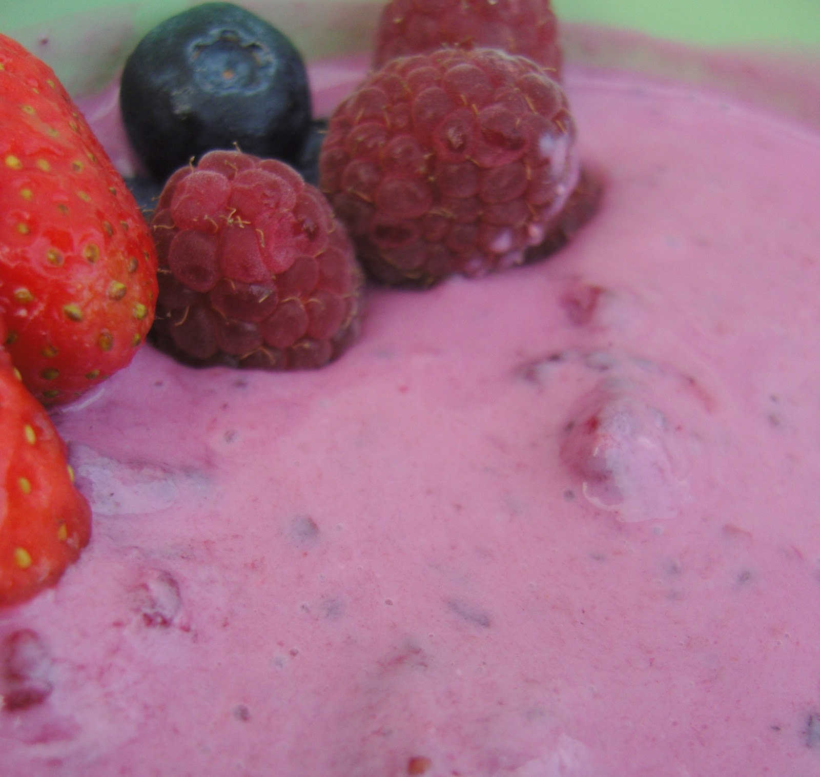 Beeren pürieren (bei TK, aufgetaut) und mit Zucker unter die Milch-Mischung