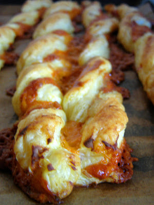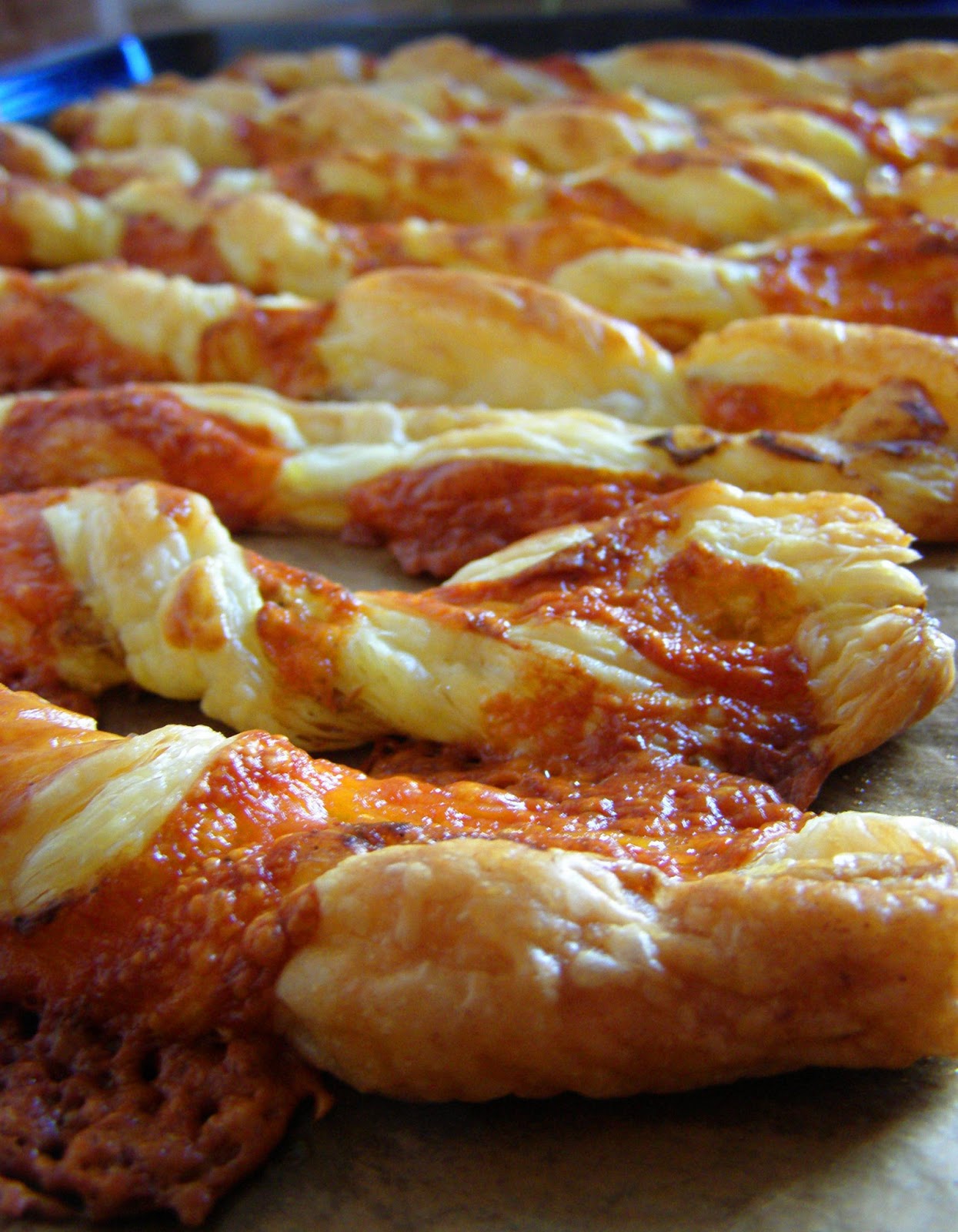 Den Blätterteig zu einem Rechteck ausrollen und eine Hälfte des Blätterteigs mit Cheddar bestreuen. Die zweiten Hälfte mit Senf bestreichen und nun die Senf-Hälfte auf die Käsehälfte klappen. Mit einem Teigroller den Teig erneut dünn ausrollen, so dass der zusammen geklappte Teig wieder annährend die Ausgangsgröße erreicht. Das Ganze nun in ca. 2,5 cm breite Streifen schneiden. Jeweils ein Ende des Streifens fest halten und den Streifen verzwirbeln. Anschließend das Ei verquirlen und die Blätterteigstreifen bepinseln. Die verzwirbelten Blätterteigstreifen nun für 20 Minuten goldbraun backen lassen.