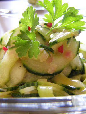 Die Gurke halbieren und das Kerngehäuse mit einem Löffel heraus kratzen. Anschließend die Gurke in dünne Scheiben schneiden oder hobeln und die Peperoni ebenfalls in kleine Würfel schneiden. Nun Zwiebeln, Knoblauch, Peperoni und Gurke in einer Schüssel mischen und die Soße darüber geben. Den Salat in Schälchen anrichten und zuletzt mit 2-3 Blättern Petersilie garnieren.