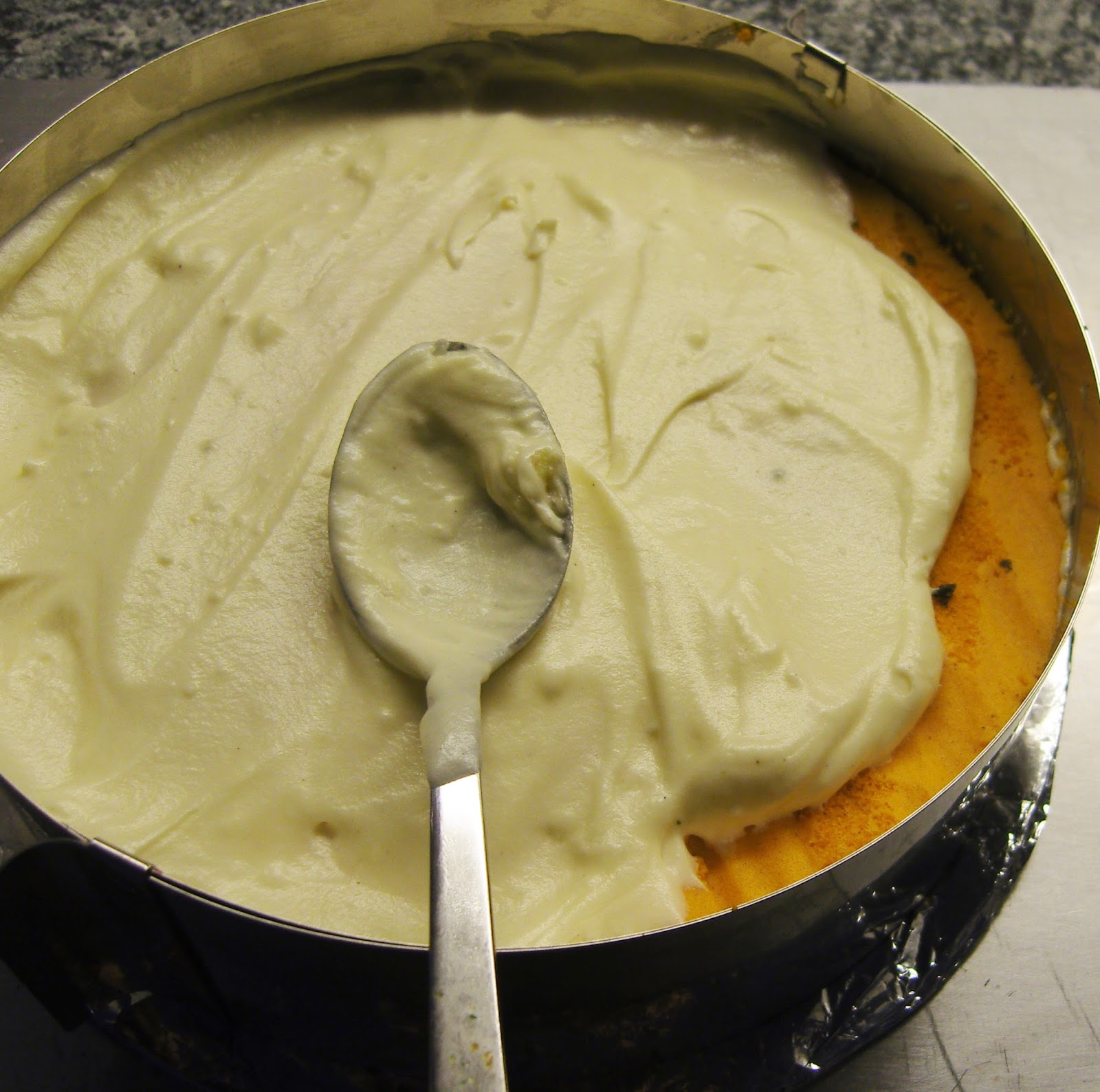 Die Torte wird nun mit Ganache eingestrichen. Da diese recht fest ist, kann man