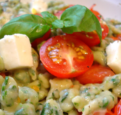 Für die Soße die halbierten Tomaten in Öl anbraten, die fertigen Spätzle ebenfalls anbraten. Zum Schluss den zerkleinerten Mozzarelle untermischen und schmelzen lassen. Mit Salz und Pfeffer würzen.