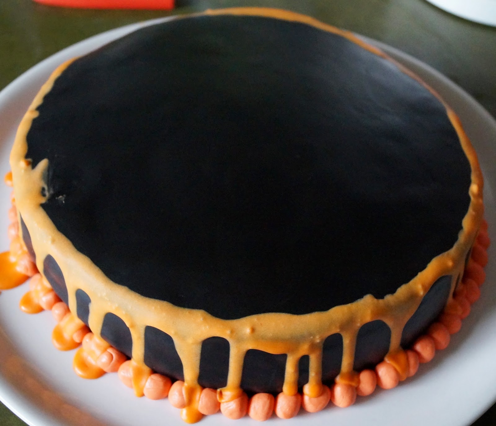 Diese Halloween-Torte hat zwar etwas Verspätung, aber natürlich lässt sich das Prinzip auch mit vielen anderen Dekorationen verwirklichen! Jetzt wo der Winter in Sicht ist, könnte man zum Beispiel ein Eisblau für den Überzug wählen und mit Royal Icing weiße „Eiszapfen“ herunter laufen lassen. Im Prinzip geht es hier nur um den Aufbau einer zweistöckigen Torte.