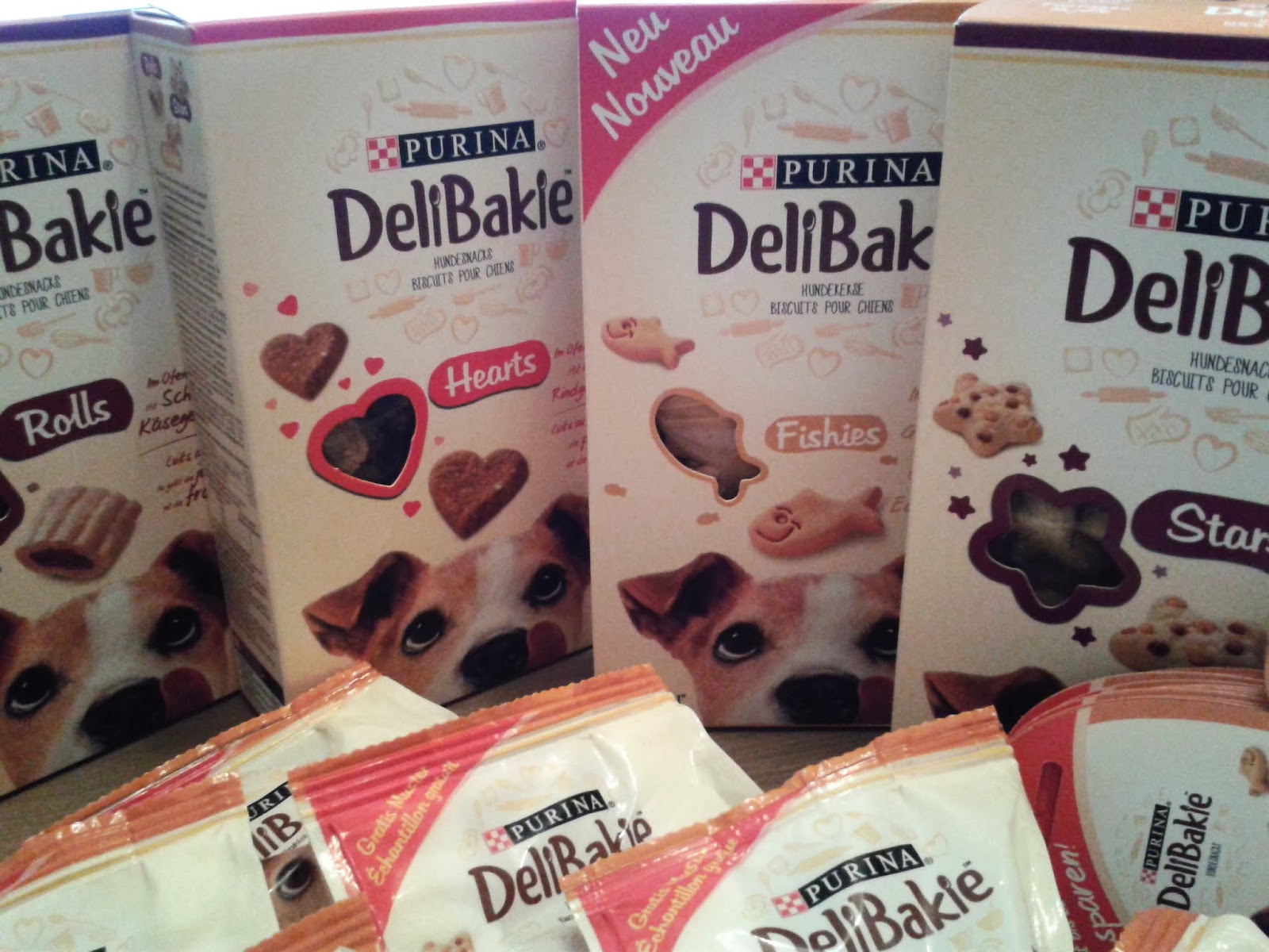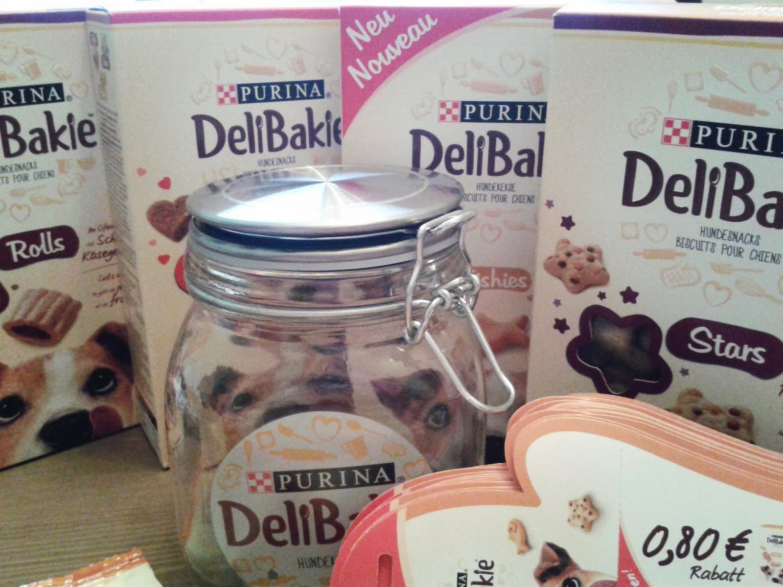 DeliBakie sind gebackene Hundekekse, die es in 4 verschiedenen Geschmackrichtungen gibt, nämlich Huhn & Rind (Hearts), Edamer & Gouda (Fishies), Käse- & Rind (Stars) und die letzten Kekse haben eine weiche Füllung aus Schinken- & Käse (Rolls). Wir durften alle Sorten probieren. In unserem Paket waren neben den 4 Sorten kleine Testpäckchen zum Verschenken, Coupons und eine Glas zum Aufbewahren der Leckerlis.
